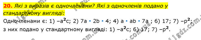 Які з виразів є одночленами? Які з одночленів подано у стандартному вигляді: Одночленами є: 1) –а2с; 2) 7a ∙ 2b ∙ 4; 4) a ∙ ab ∙ 7a ; 6) 17; 7) –р2; з них подано у стандартному вигляді: 1) –а2с; 6) 17; 7) –р2.