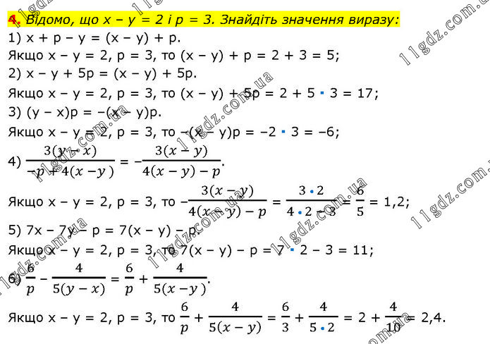 Відомо, що х – у = 2 і р = 3. Знайдіть значення виразу: 1) x + р – у = (x – у) + р. Якщо х – у = 2, р = 3, то (х – у) + р = 2 + 3 = 5; 2) х – у + 5р = (x – у) + 5р. Якщо х – у = 2, р = 3, то (х – у) + 5р = 2 + 5 ∙ 3 = 17; 3) (y – х)р = –(х – у)р. Якщо x – у = 2, р = 3, то –(x – y)p = –2 ∙ 3 = –6; 4) (3(y - x))/(-p + 4(x -y )) = –(3(x - y))/(4(x - y) - p). Якщо х – у = 2, р = 3, то –(3(x - y))/(4(x - y) - p) = (3 • 2)/(4 • 2 - 3) = 6/5 = 1,2; 5) 7x – 7у – р = 7(x – у) – р. Якщо х – у = 2, р = 3, то 7(x – у) – р = 7 ∙ 2 – 3 = 11; 6) 6/p – 4/(5(y - x)) = 6/p + 4/(5(x -y )). Якщо х – у = 2, р = 3, то 6/p + 4/5(x - y) = 6/3 + 4/(5 • 2 ) = 2 + 4/10 = 2,4.