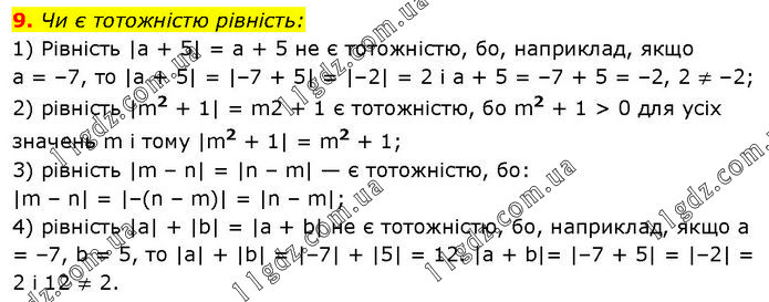 Чи є тотожністю рівність: 1) Рівність |a + 5| = a + 5 не є тотожністю, бо, наприклад, якщо a = –7, то |а + 5| = |–7 + 5| = |–2| = 2 і а + 5 = –7 + 5 = –2, 2 ≠ –2; 2) рівність |m2 + 1| = m2 + 1 є тотожністю, бо m2 + 1 > 0 для усіх значень m і тому |m2 + 1| = m2 + 1; 3) рівність |m – n| = |n – m| — є тотожністю, бо: |m – n| = |–(n – m)| = |n – m|; 4) рівність |а| + |b| = |а + b| не є тотожністю, бо, наприклад, якщо а = –7, b = 5, то |a| + |b| = |–7| + |5| = 12. |a + b|= |–7 + 5| = |–2| = 2 і 12 ≠ 2.