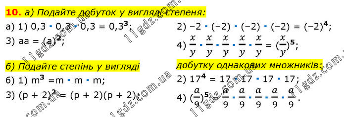 а) Подайте добуток у вигляді степеня: а) 1) 0,3 ∙ 0,3 ∙ 0,3 = 0,33; 3) аа = (а)2; б) Подайте степінь у вигляді б) 1) m3 =m ∙ m ∙ m; 3) (р + 2)2 = (р + 2)(р + 2); 2) –2 ∙ (–2) ∙ (–2) ∙ (–2) = (–2)4; 4) x/y ∙ x/y ∙ x/y ∙ x/y ∙ x/y = (x/y)5; добутку однакових множників: 2) 174 = 17 ∙ 17 ∙ 17 ∙ 17; 4) (a/9)5 = a/9 ∙ a/9 ∙ a/9 ∙ a/9 ∙ a/9 .