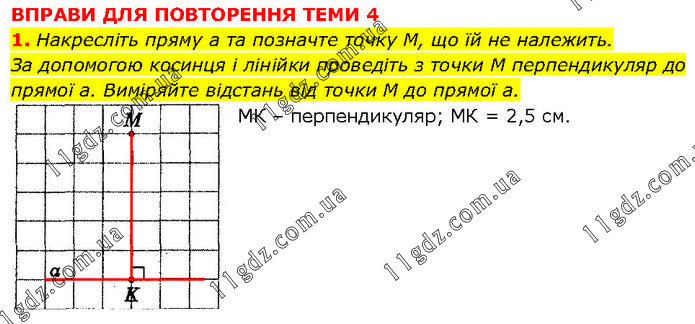 ВПРАВИ ДЛЯ ПОВТОРЕННЯ ТЕМИ 4 1. Накресліть пряму а та позначте точку М, що їй не належить. За допомогою косинця і лінійки проведіть з точки M перпендикуляр до прямої а. Виміряйте відстань від точки M до прямої а. МК – перпендикуляр; МК = 2,5 см.