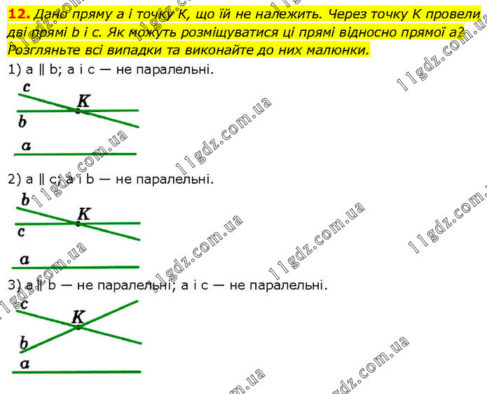 Дано пряму а і точку К, що їй не належить. Через точку K провели дві прямі b і с. Як можуть розміщуватися ці прямі відносно прямої а? Розгляньте всі випадки та виконайте до них малюнки. 1) а ∥ b; а і с — не паралельні. 2) a ∥ c; a і b — не паралельні. 3) a ∥ b — не паралельні; а і c — не паралельні.