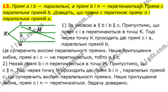 Прямі а і b — паралельні, а прямі b і n — перетинаються. Пряма с паралельна прямій b. Доведіть, що пряма с перетинає пряму n і паралельна прямій а. 1) За умовою a ∥ b і b ∥ с. Припустимо, що прямі с і а перетинаються в точці К. Тоді через точку K проходить дві прямі с і а, паралельні прямій b. Це суперечить аксіомі паралельності прямих. Наше припущення хибне, прямі а і с — не перетинаються, тобто а ∥ с. 2) Нехай прямі b i n перетинаються в точці М. Припустимо, що с ∥ n. Тоді через точку M проходить дві прямі b i n , паралельні прямій с. Це суперечить аксіомі паралельності прямих. Наше припущення хибне, прямі с і n — перетинаються. Задачу доведено.