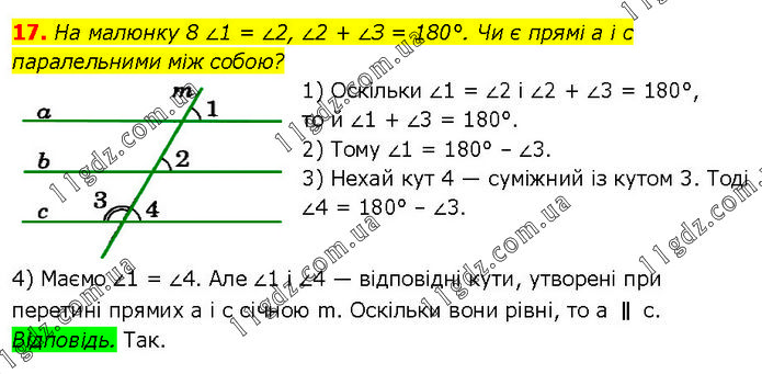На малюнку 8 ∠1 = ∠2, ∠2 + ∠З = 180°. Чи є прямі а і с паралельними між собою? 1) Оскільки ∠1 = ∠2 і ∠2 + ∠3 = 180°, то й ∠1 + ∠3 = 180°. 2) Тому ∠1 = 180° – ∠3. 3) Нехай кут 4 — суміжний із кутом 3. Тоді ∠4 = 180° – ∠3. 4) Маємо ∠1 = ∠4. Але ∠1 і ∠4 — відповідні кути, утворені при перетині прямих а і с січною m. Оскільки вони рівні, то а ∥ с. Відповідь. Так.