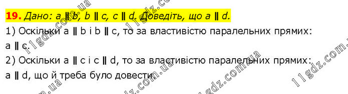 Дано: а ∥ b, b ∥ с, с ∥ d. Доведіть, що a ∥ d. 1) Оскільки a ∥ b і b ∥ с, то за властивістю паралельних прямих: а ∥ с. 2) Оскільки a ∥ с і c ∥ d, то за властивістю паралельних прямих: a ∥ d, що й треба було довести.