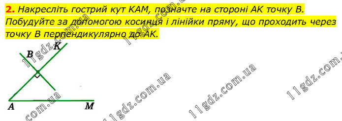 Накресліть гострий кут KAM, позначте на стороні AK точку В. Побудуйте за допомогою косинця і лінійки пряму, що проходить через точку В перпендикулярно до AK.