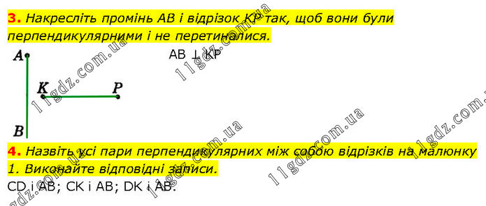 3. Накресліть промінь AB і відрізок KP так, щоб вони були перпендикулярними і не перетиналися. АВ ⊥ КР 4. Назвіть усі пари перпендикулярних між собою відрізків на малюнку 1. Виконайте відповідні записи. CD і AB; CK i AB; DK і AB.