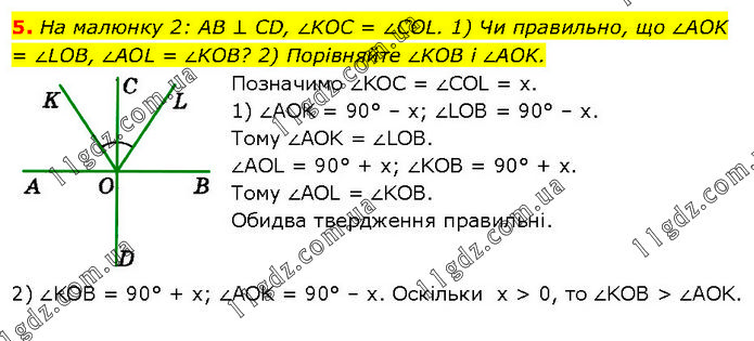 5. На малюнку 2: AB ⊥ CD, ∠KOC = ∠COL. 1) Чи правильно, що ∠AOK = ∠LOB, ∠AOL = ∠KOB? 2) Порівняйте ∠KOB і ∠AOK. Позначимо ∠KOC = ∠COL = х. 1) ∠AOK = 90° – х; ∠LOB = 90° – х. Тому ∠AOK = ∠LOB. ∠AOL = 90° + х; ∠KOB = 90° + х. Тому ∠AOL = ∠KOB. Обидва твердження правильні. 2) ∠KOB = 90° + х; ∠AOK = 90° – х. Оскільки х > 0, то ∠KOB > ∠AOK.