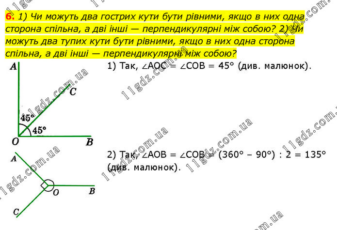 1) Чи можуть два гострих кути бути рівними, якщо в них одна сторона спільна, а дві інші — перпендикулярні між собою? 2) Чи можуть два тупих кути бути рівними, якщо в них одна сторона спільна, а дві інші — перпендикулярні між собою? 1) Так, ∠AOC = ∠COB = 45° (див. малюнок). 2) Так, ∠AOB = ∠COB = (360° – 90°) : 2 = 135° (див. малюнок).