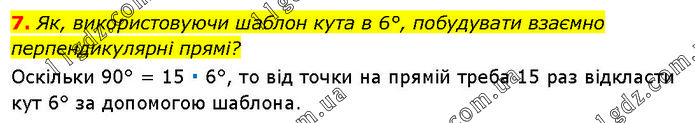 Як, використовуючи шаблон кута в 6°, побудувати взаємно перпендикулярні прямі? Оскільки 90° = 15 ∙ 6°, то від точки на прямій треба 15 раз відкласти кут 6° за допомогою шаблона.