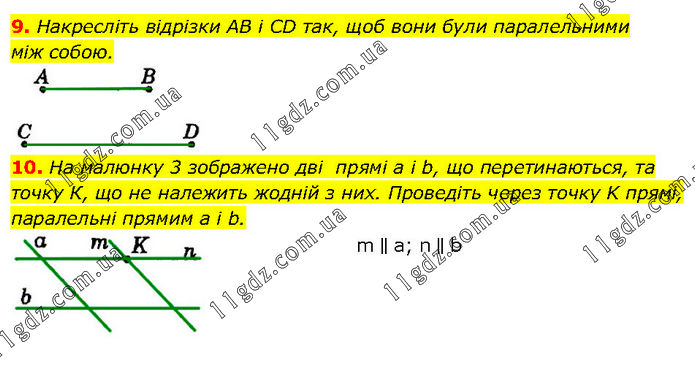 9. Накресліть відрізки AB і CD так, щоб вони були паралельними між собою. 10. На малюнку 3 зображено дві прямі а і b, що перетинаються, та точку К, що не належить жодній з них. Проведіть через точку K прямі, паралельні прямим а і b. m ∥ a; n ∥ b