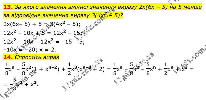 13. За якого значення змінної значення виразу 2х(6х – 5) на 5 менше за відповідне значення виразу 3(4х2 – 5)? 2х(6х– 5) + 5 = 3(4х2 – 5); 12х2 – 10х + 5 = 12х2 – 15; 12х2 – 10x – 12x2 = –15 – 5; –10х = –20; х = 2. 14. Спростіть вираз 1/8хn – 5/8х2(1 + хn–2) + 1/2х3(хn–3 + 2) = 1/8хn – 5/8х2 – 5/8хn + 1/2хn + х3 = –5/8х2 + х3.