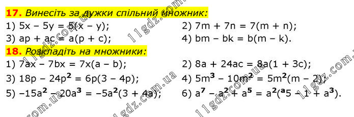 17. Винесіть за дужки спільний множник: 1) 5х – 5у = 5(х – у); 3) ар + ас = а(р + с); 2) 7m + 7n = 7(m + n); 4) bm – bk = b(m – k). 18. Розкладіть на множники: 1) 7ax – 7bx = 7х(а – b); 3) 18р – 24p2 = 6р(3 – 4р); 5) –15a2 – 20а3 = –5а2(3 + 4a); 2) 8a + 24aс = 8а(1 + Зс); 4) 5m3 – 10m2 = 5m2(m – 2); 6) а7 – а2 + а5 = а2(а5 – 1 + а3).