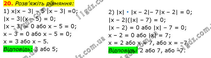 20. Розв’яжіть рівняння: 1) x|x – 3| – 5 |x – 3| =0; |х – 3|(х – 5) = 0; |х – 3| = 0 або х – 5 = 0; х – 3 = 0 або х – 5 = 0; х = 3 або х – 5. Відповідь: З або 5; 2) |х| ∙ |х – 2|– 7|x – 2| = 0; |х – 2|(|x| – 7) = 0; |x – 2) = 0 або |x| – 7 = 0; х – 2 = 0 або |х| = 7; х = 2 або х = 7, або х = –7. Відповідь: 2 або 7, або –7.