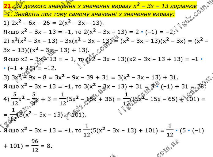 21. За деякого значення х значення виразу х2 – Зх – 13 дорівнює –1. Знайдіть при тому самому значенні х значення виразу: 1) 2х2 – 6х – 26 = 2(х2 – Зх – 13). Якщо x2 – Зх – 13 = –1, то 2(х2 – Зх – 13) = 2 ∙ (–1) = –2; 2) х2(х2 – Зх – 13) – Зх(х2 – Зх – 13) = (х2 – Зх – 13)(х2 – Зх) = (х2 – Зх – 13)((х2 – Зх – 13) + 13). Якщо x2 – 3х – 13 = – 1, то (х2 – 3х – 13)(х2 – 3х – 13 + 13) = –1 ∙ ∙ (–1 + 13) = –12. 3) 3х2 – 9х – 8 = Зх2 – 9х – 39 + 31 = 3(х2 – Зх – 13) + 31. Якщо x2 – Зх – 13 = –1, то 3(х2 – Зх – 13) + 31 = 3 ∙ (–1) + 31 = 28; 4) 5/12х2 – 5/4х + 3 = 1/12(5х2 – 15х + 36) = 1/12((5х2– 15х – 65) + 101) = = 1/12(5(x2 – 3x – 13) + 101). Якщо x2 – Зх – 13 = –1, то 1/12(5(х2 – Зх – 13) + 101) = 1/12 ∙ (5 ∙ (–1) + 101) = 96/12 = 8.