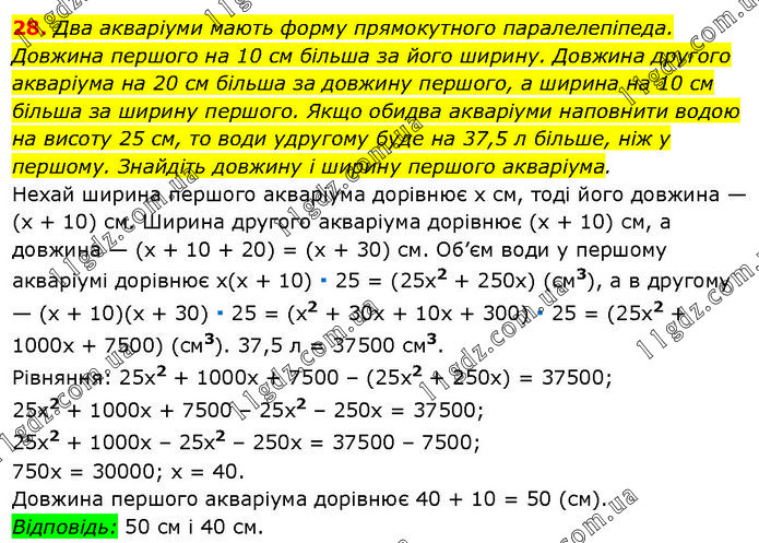 Два акваріуми мають форму прямокутного паралелепіпеда. Довжина першого на 10 см більша за його ширину. Довжина другого акваріума на 20 см більша за довжину першого, а ширина на 10 см більша за ширину першого. Якщо обидва акваріуми наповнити водою на висоту 25 см, то води удругому буде на 37,5 л більше, ніж у першому. Знайдіть довжину і ширину першого акваріума. Нехай ширина першого акваріума дорівнює х см, тоді його довжина — (х + 10) см. Ширина другого акваріума дорівнює (х + 10) см, а довжина — (х + 10 + 20) = (х + 30) см. Об’єм води у першому акваріумі дорівнює х(х + 10) ∙ 25 = (25x2 + 250х) (см3), а в другому — (х + 10)(х + 30) ∙ 25 = (х2 + 30х + 10x + 300) ∙ 25 = (25х2 + 1000x + 7500) (см3). 37,5 л = 37500 см3. Рівняння: 25х2 + 1000х + 7500 – (25х2 + 250х) = 37500; 25x2 + 1000х + 7500 – 25х2 – 250х = 37500; 25х2 + 1000x – 25х2 – 250х = 37500 – 7500; 750х = 30000; х = 40. Довжина першого акваріума дорівнює 40 + 10 = 50 (см). Відповідь: 50 см і 40 см.