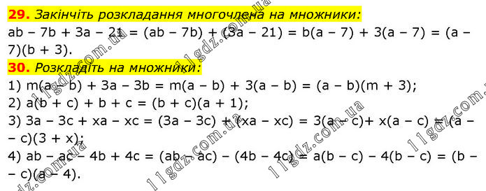 29. Закінчіть розкладання многочлена на множники: ab – 7b + За – 21 = (ab – 7b) + (За – 21) = b(а – 7) + 3(а – 7) = (а – 7)(b + 3). 30. Розкладіть на множники: 1) m(а – b) + За – Зb = m(а – b) + 3(а – b) = (а – b)(m + 3); 2) a(b + с) + b + c = (b + с)(а + 1); 3) За – Зс + ха – хс = (За – Зс) + (ха – хс) = 3(а – с)+ х(а – с) = (а – с)(3 + х); 4) ab – ас – 4b + 4c = (ab – ас) – (4b – 4c) = а(b – с) – 4(b – с) = (b – с)(а – 4).