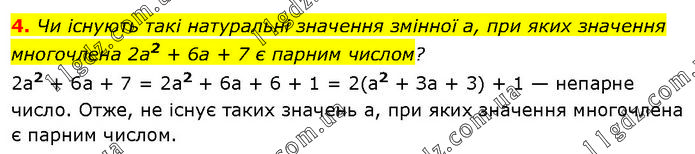 4. Чи існують такі натуральні значення змінної а, при яких значення многочлена 2а2 + 6а + 7 є парним числом? 2а2 + 6а + 7 = 2а2 + 6а + 6 + 1 = 2(а2 + За + 3) + 1 — непарне число. Отже, не існує таких значень а, при яких значення многочлена є парним числом.
