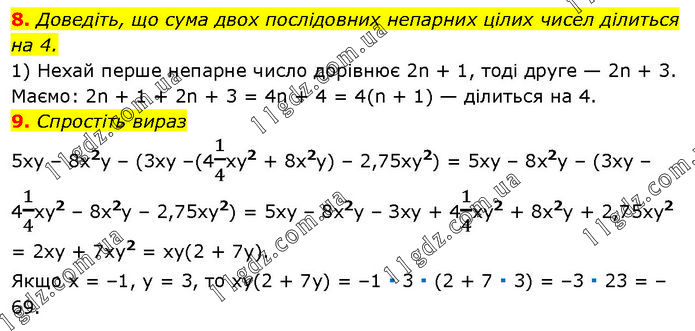 8. Доведіть, що сума двох послідовних непарних цілих чисел ділиться на 4. Нехай перше непарне число дорівнює 2n + 1, тоді друге — 2n + 3. Маємо: 2n + 1 + 2n + 3 = 4n + 4 = 4(n + 1) — ділиться на 4. 9. Спростіть вираз 5xy – 8х2y – (3ху –(41/4ху2 + 8х2у) – 2,75xy2) = 5ху – 8х2у – (3ху – 41/4ху2 – 8х2у – 2,75xу2) = 5xy – 8х2у – Зху + 41/4ху2 + 8x2y + 2,75ху2 = 2xy + 7ху2 = ху(2 + 7у). Якщо х = –1, у = 3, то ху(2 + 7у) = –1 ∙ 3 ∙ (2 + 7 ∙ 3) = –3 ∙ 23 = –69.