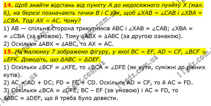 14. Щоб знайти відстань від пункту А до недосяжного пункту X (мал. 6), на березі позначають точки B i C так, щоб ∠XAB = ∠CAB і ∠XBA = ∠CBA. Тоді AX = АС. Чому? 1) AB — спільна сторона трикутників ABC і ∠XAB = ∠CAB; ∠XBA = = ∠CBA (за умовою). Тому ∆ABX = ∆ABC (за другою ознакою). 2) Оскільки ∆ABX = ∆ABC, то AX = АС. 15. На малюнку 7 зображено фігуру, у якої BC = EF, AD = CF, ∠BCF = ∠EFK. Доведіть, що ΔABC = ΔDEF. 1) Оскільки ∠BCF = ∠KFE, то ∠BCA = ∠DFE (як кути, суміжні до рівних кутів). 2) AC = AD + DC; FD = FC + CD. Оскільки AD = CF, то й AC = FD. 3) Оскільки ∠BCA = ∠DFE; BC – EF (за умовою) і AC = FD, то ∆ABC = ∆DEF, що й треба було довести.