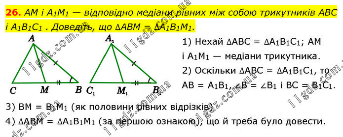 AM і A1M1 — відповідно медіани рівних між собою трикутників ABC і A1B1C1 . Доведіть, що ∆ABM = ∆A1B1M1. 1) Нехай ∆ABC = ∆A1B1C1; AM і A1M1 — медіани трикутника. 2) Оскільки ∆ABC = ∆A1B1C1, то AB = A1B1, ∠B = ∠B1 і BC = B1C1. 3) BM = B1M1 (як половини рівних відрізків) 4) ∆ABM = ∆A1B1M1 (за першою ознакою), що й треба було довести.
