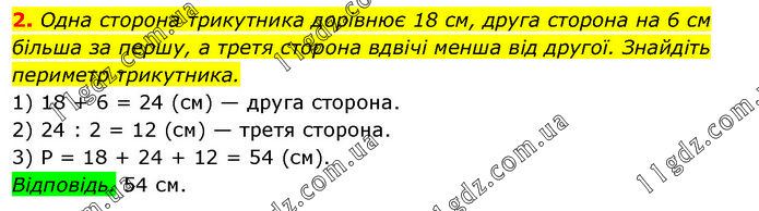Одна сторона трикутника дорівнює 18 см, друга сторона на 6 см більша за першу, а третя сторона вдвічі менша від другої. Знайдіть периметр трикутника. 1) 18 + 6 = 24 (см) — друга сторона. 2) 24 : 2 = 12 (см) — третя сторона. 3) P = 18 + 24 + 12 = 54 (см). Відповідь. 54 см.