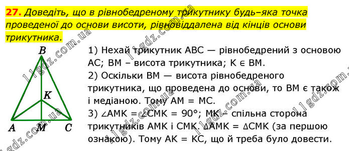 Доведіть, що в рівнобедреному трикутнику будь–яка точка проведеної до основи висоти, рівновіддалена від кінців основи трикутника. 1) Нехай трикутник ABC — рівнобедрений з основою AC; BM – висота трикутника; K ∈ BM. 2) Оскільки BM — висота рівнобедреного трикутника, що проведена до основи, то BM є також і медіаною. Тому AM = MC. 3) ∠AMK = ∠CMK = 90°; MK – спільна сторона трикутників AMK і CMK. ∆AMK = ∆CMK (за першою ознакою). Тому AK = KC, що й треба було довести.
