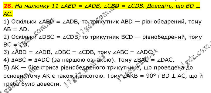 На малюнку 11 ∠ABD = ∠ADB, ∠CBD = ∠CDB. Доведіть, що BD ⊥ АС. 1) Оскільки ∠ABD = ∠ADB, то трикутник ABD — рівнобедрений, тому AB = AD. 2) Оскільки ∠DBC = ∠CDB, то трикутник BCD — рівнобедрений, тому BC = CD. 3) ∠ABD = ∠ADB, ∠DBC = ∠CDB, тому ∠ABC = ∠ADC. 4) ∆ABC = ∆ADC (за першою ознакою). Тому ∠BAC = ∠DAC. 5) AK — бісектриса рівнобедреного трикутника, що проведена до основи, тому AK є також і висотою. Тому ∠AKB = 90° і BD ⊥ АС, що й треба було довести.
