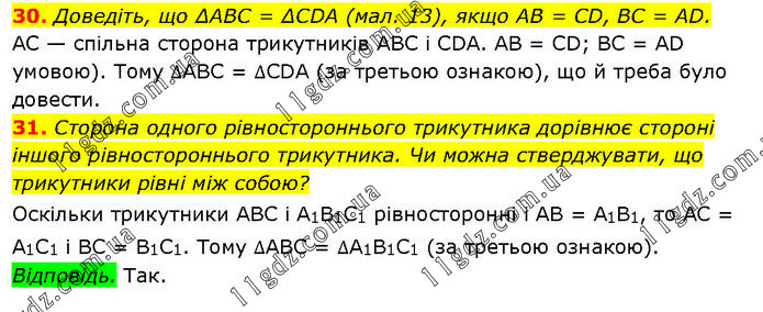 30. Доведіть, що ΔABC = ΔCDA (мал. 13), якщо AB = CD, BC = AD. AC — спільна сторона трикутників ABC і CDA. AB = CD; BC = AD умовою). Тому ∆ABC = ∆CDA (за третьою ознакою), що й треба було довести. 31. Сторона одного рівностороннього трикутника дорівнює стороні іншого рівностороннього трикутника. Чи можна стверджувати, що трикутники рівні між собою? Оскільки трикутники ABC і A1B1C1 рівносторонні і AB = A1B1, то AC = A1C1 і BC = B1C1. Тому ∆ABC = ∆A1B1C1 (за третьою ознакою). Відповідь. Так.