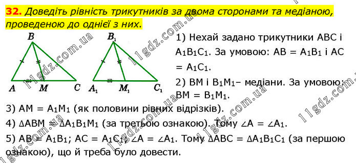 Доведіть рівність трикутників за двома сторонами та медіаною, проведеною до однієї з них. 1) Нехай задано трикутники ABC і A1B1C1. За умовою: AB = A1B1 і AC = A1C1. 2) BM і B1M1– медіани. За умовою: BM = B1M1. 3) AM = A1M1 (як половини рівних відрізків). 4) ∆ABM = ∆A1B1M1 (за третьою ознакою). Тому ∠A = ∠A1. 5) AB = A1B1; AC = A1C1; ∠A = ∠A1. Тому ∆ABC = ∆A1B1C1 (за першою ознакою), що й треба було довести.