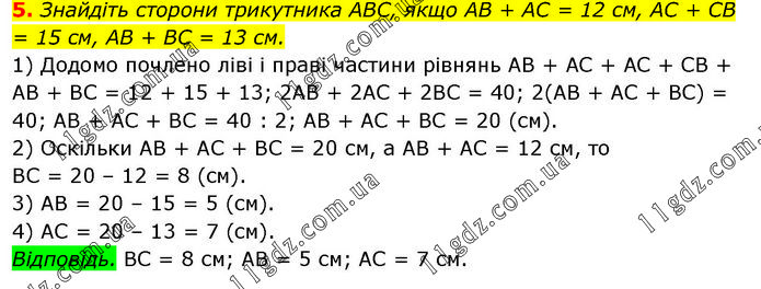 Знайдіть сторони трикутника ABC, якщо AB + AC = 12 см, AC + CB = 15 см, AB + BC = 13 см. 1) Додомо почлено ліві і праві частини рівнянь AB + AC + AC + CB + AB + BC = 12 + 15 + 13; 2AB + 2AC + 2ВС = 40; 2(AB + AC + BC) = 40; AB + AC + BC = 40 : 2; AB + AC + BC = 20 (см). 2) Оскільки AB + AC + BC = 20 см, a AB + AC = 12 см, то BC = 20 – 12 = 8 (см). 3) AB = 20 – 15 = 5 (см). 4) AC = 20 – 13 = 7 (см). Відповідь. BC = 8 см; AB = 5 см; AC = 7 см.