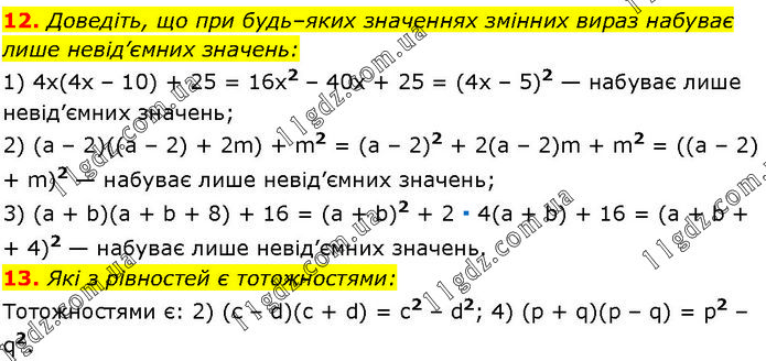12. Доведіть, що при будь–яких значеннях змінних вираз набуває лише невід’ємних значень: 1) 4x(4x – 10) + 25 = 16x2 – 40x + 25 = (4x – 5)2 — набуває лише невід’ємних значень; 2) (а – 2)((а – 2) + 2m) + m2 = (а – 2)2 + 2(а – 2)m + m2 = ((а – 2) + m)2 — набуває лише невід’ємних значень; 3) (а + b)(a + b + 8) + 16 = (а + b)2 + 2 ∙ 4(а + b) + 16 = (а + b + 4)2 — набуває лише невід’ємних значень. 13. Які з рівностей є тотожностями: Тотожностями є: 2) (с – d)(c + d) = c2 – d2; 4) (p + q)(p – q) = p2 – q2.