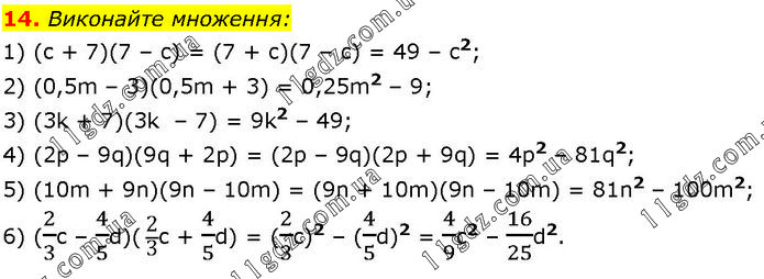 Виконайте множення: 1) (c + 7)(7 – c) = (7 + c)(7 – c) = 49 – c2; 2) (0,5m – 3)(0,5m + 3) = 0,25m2 – 9; 3) (3k + 7)(3k – 7) = 9k2 – 49; 4) (2р – 9q)(9q + 2p) = (2p – 9q)(2p + 9q) = 4p2 – 81q2; 5) (10m + 9n)(9n – 10m) = (9n + 10m)(9n – 10m) = 81n2 – 100m2; 6) (2/3c – 4/5d)( 2/3c + 4/5d) = (2/3c)2 – (4/5d)2 = 4/9c2 – 16/25d2.