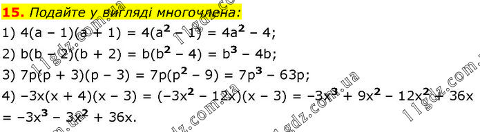 Подайте у вигляді многочлена: 1) 4(a – 1)(a + 1) = 4(a2 – 1) = 4a2 – 4; 2) b(b – 2)(b + 2) = b(b2 – 4) = b3 – 4b; 3) 7p(p + 3)(p – 3) = 7p(p2 – 9) = 7p3 – 63p; 4) –3x(x + 4)(x – 3) = (–3x2 – 12x)(x – 3) = –Зх3 + 9x2 – 12x2 + 36x = –3x3 – 3x2 + 36x.