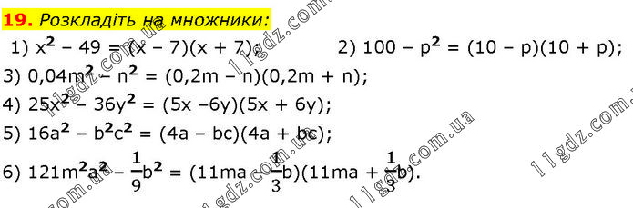 Розкладіть на множники: 1) x2 – 49 = (х – 7)(х + 7); 2) 100 – p2 = (10 – р)(10 + р); 3) 0,04m2 – n2 = (0,2m – n)(0,2m + n); 4) 25х2 – 36у2 = (5х –6у)(5х + 6у); 5) 16а2 – b2с2 = (4а – bc)(4a + bс); 6) 121m2а2 – 1/9b2 = (11mа – 1/3b)(11mа + 1/3b).