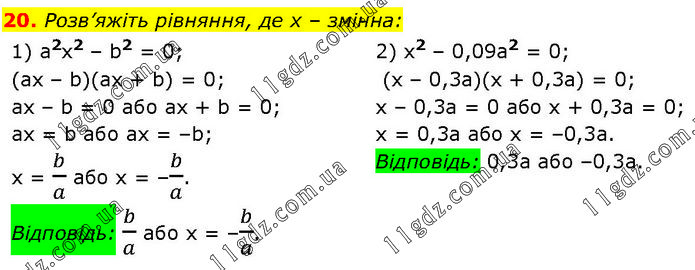 Розв’яжіть рівняння, де х – змінна: 1) а2х2 – b2 = 0; (ах – b)(ах + b) = 0; ах – b = 0 або ах + b = 0; ах = b або ах = –b; х = b/a або х = –b/a. Відповідь: b/a або х = –b/a. 2) x2 – 0,09а2 = 0; (х – 0,3а)(x + 0,3а) = 0; х – 0,3а = 0 або х + 0,3а = 0; х = 0,3а або х = –0,3а. Відповідь: 0,3а або –0,3а.