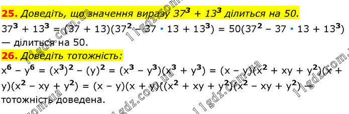 25. Доведіть, що значення виразу З73 + 133 ділиться на 50. 373 + 133 = (37 + 13)(372 – 37 ∙ 13 + 133) = 50(372 – 37 ∙ 13 + 133) — ділиться на 50. 26. Доведіть тотожність: x6 – у6 = (x3)2 – (y)2 = (х3 – у3)(х3 + у3) = (х – у)(x2 + ху + у2)(х + у)(х2 – ху + у2) = (х – у)(х + у)((х2 + ху + у2)(х2 – ху + у2) — тотожність доведена.