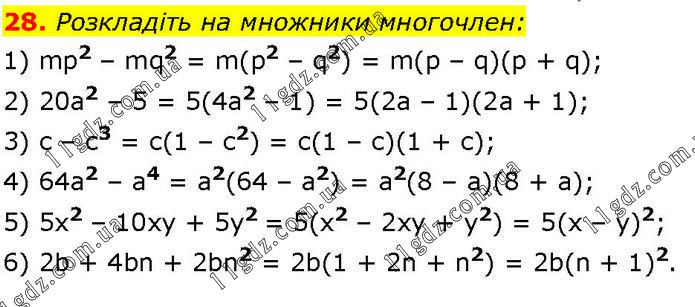Розкладіть на множники многочлен: 1) mр2 – mq2 = m(р2 – q2) = m(р – q)(p + q); 2) 20а2 – 5 = 5(4а2 – 1) = 5(2а – 1)(2а + 1); 3) с – с3 = с(1 – с2) = с(1 – с)(1 + с); 4) 64а2 – а4 = а2(64 – а2) = а2(8 – а)(8 + а); 5) 5х2 – 10xy + 5у2 = 5(х2 – 2ху + у2) = 5(х – у)2; 6) 2b + 4bn + 2bn2 = 2b(1 + 2n + n2) = 2b(n + 1)2.
