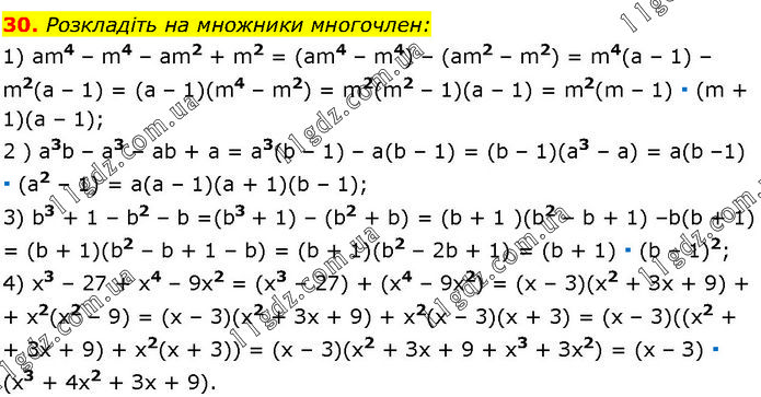 Розкладіть на множники многочлен: 1) аm4 – m4 – аm2 + m2 = (аm4 – m4) – (аm2 – m2) = m4(а – 1) – m2(а – 1) = (a – 1)(m4 – m2) = m2(m2 – 1)(а – 1) = m2(m – 1) ∙ (m + 1)(а – 1); 2) a3b – a3 – ab + a = а3(b – 1) – а(b – 1) = (b – 1)(а3 – а) = а(b – 1) ∙ (а2 – 1) = а(а – 1)(а + 1)(b – 1); 3) b3 + 1 – b2 – b = (b3 + 1) – (b2 + b) = (b + 1 )(b2 – b + 1) – b(b + 1) = (b + 1)(b2 – b + 1 – b) = (b + 1)(b2 – 2b + 1) = (b + 1) ∙ (b – 1)2; 4) x3 – 27 + x4 – 9х2 = (х3 – 27) + (х4 – 9х2) = (х – 3)(х2 + Зх + 9) + х2(х2 – 9) = (х – 3)(х2 + Зх + 9) + х2(х – 3)(х + 3) = (х – 3)((х2 + 3х + 9) + х2(х + 3)) = (х – 3)(х2 + Зх + 9 + x3 + Зх2) = (х – З) ∙ (х3 + 4х2 + Зх + 9).