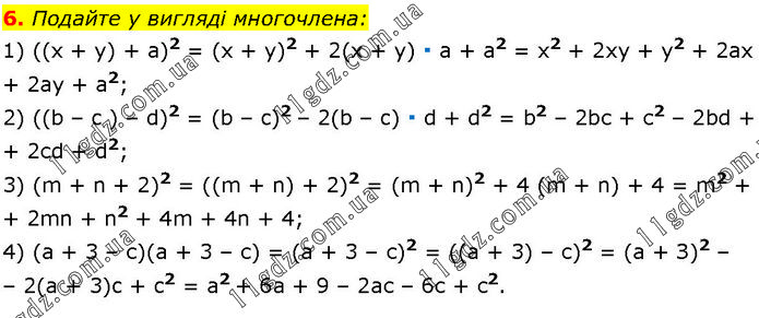 Подайте у вигляді многочлена: 1) ((x + у) + а)2 = (х + у)2 + 2(х + y) ∙ а + а2 = x2 + 2ху + у2 + 2ах + 2ау + а2; 2) ((b – c ) – d)2 = (b – c)2 – 2(b – c) ∙ d + d2 = b2 – 2bс + с2 – 2bd + 2сd + d2; 3) (m + n + 2)2 = ((m + n) + 2)2 = (m + n)2 + 4 (m + n) + 4 = m2 + 2mn + n2 + 4m + 4n + 4; 4) (а + 3 – с)(а + 3 – с) = (а + 3 – с)2 = ((а + 3) – с)2 = (а + З)2 – 2(а + 3)c + c2 = а2 + 6а + 9 – 2ас – 6с + с2.