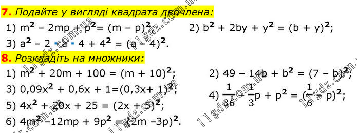 7. Подайте у вигляді квадрата двочлена: 1) m2 – 2mр + р2= (m – р)2; 3) а2 – 2 ∙ а ∙ 4 + 42 = (а – 4)2. 2) b2 + 2bу + у2 = (b + у)2; 8. Розкладіть на множники: 1) m2 + 20m + 100 = (m + 10)2; 3) 0,09x2 + 0,6x + 1=(0,3x+ 1)2; 5) 4х2 + 20x + 25 = (2х + 5)2; 6) 4m2 –12mр + 9р2 = (2m –Зр)2. 2) 49 – 14b + b2 = (7 – b)2; 4) 1/36 – 1/3p + p2 = (1/6 – p)2;