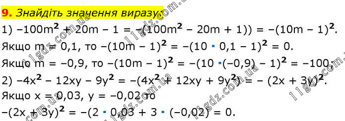 Знайдіть значення виразу: 1) –100m2 + 20m – 1 = –(100m2 – 20m + 1)) = –(10m – 1)2. Якщо m = 0,1, то –(10m – 1)2 = –(10 ∙ 0,1 – 1)2 = 0. Якщо m = –0,9, то –(10m – 1)2 = –(10 ∙(–0,9) – 1)2 = –100; 2) –4х2 – 12ху – 9у2 = –(4x2 + 12xу + 9у2) = – (2х + Зу)2. Якщо x = 0,03, у = –0,02 то –(2x + Зу)2 = –(2 ∙ 0,03 + 3 ∙ (–0,02) = 0.