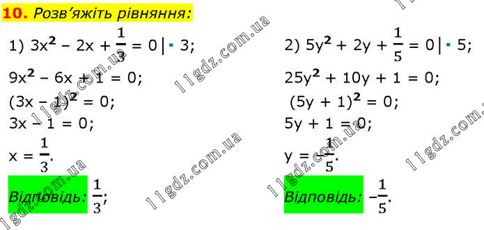 Розв’яжіть рівняння: 1) 3x2 – 2x + 1/3 = 0│∙ 3; 9x2 – 6x + 1 = 0; (3x – 1)2 = 0; 3x – 1 = 0; x = 1/3. Відповідь: 1/3; 2) 5y2 + 2y + 1/5 = 0│∙ 5; 25y2 + 10y + 1 = 0; (5y + 1)2 = 0; 5y + 1 = 0; y = –1/5. Відповідь: –1/5.