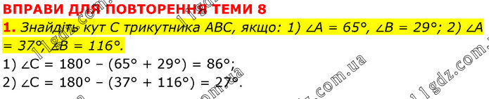 Знайдіть кут C трикутника ABC, якщо: 1) ∠A = 65°, ∠B = 29°; 2) ∠A = 37°, ∠B = 116°. 1) ∠C = 180° – (65° + 29°) = 86°; 2) ∠C = 180° – (37° + 116°) = 27°.