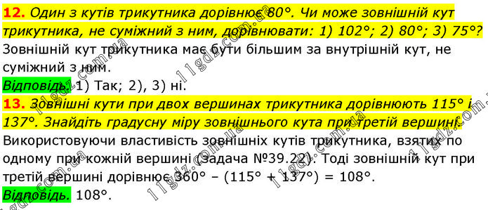 12. Один з кутів трикутника дорівнює 80°. Чи може зовнішній кут трикутника, не суміжний з ним, дорівнювати: 1) 102°; 2) 80°; 3) 75°? Зовнішній кут трикутника має бути більшим за внутрішній кут, не суміжний з ним. Відповідь. 1) Так; 2), 3) ні. 13. Зовнішні кути при двох вершинах трикутника дорівнюють 115° і 137°. Знайдіть градусну міру зовнішнього кута при третій вершині. Використовуючи властивість зовнішніх кутів трикутника, взятих по одному при кожній вершині (задача №39.22). Тоді зовнішній кут при третій вершині дорівнює 360° – (115° + 137°) = 108°. Відповідь. 108°.