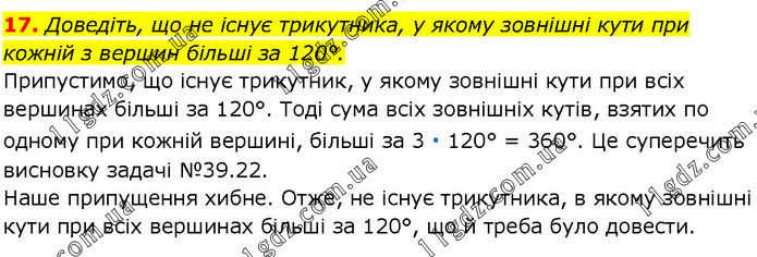 Доведіть, що не існує трикутника, у якому зовнішні кути при кожній з вершин більші за 120°. Припустимо, що існує трикутник, у якому зовнішні кути при всіх вершинах більші за 120°. Тоді сума всіх зовнішніх кутів, взятих по одному при кожній вершині, більші за 3 ∙ 120° = 360°. Це суперечить висновку задачі №39.22. Наше припущення хибне. Отже, не існує трикутника, в якому зовнішні кути при всіх вершинах більші за 120°, що й треба було довести.