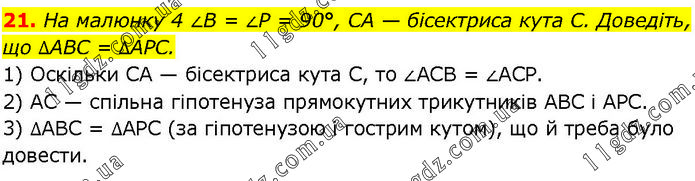 На малюнку 4 ∠B = ∠P = 90°, CA — бісектриса кута С. Доведіть, що ∆ABC = ∆APC. 1) Оскільки CA — бісектриса кута С, то ∠ACB = ∠ACP. 2) AC — спільна гіпотенуза прямокутних трикутників ABC і APC. 3) ∆ABC = ∆AРC (за гіпотенузою і гострим кутом), що й треба було довести.