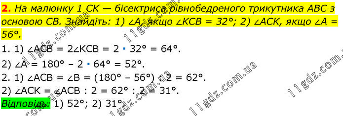 На малюнку 1 CK — бісектриса рівнобедреного трикутника ABC з основою CB. Знайдіть: 1) ∠A, якщо ∠KCB = 32°; 2) ∠ACK, якщо ∠A = 56°. 1. 1) ∠ACB = 2∠KCB = 2 ∙ 32° = 64°. 2) ∠A = 180° – 2 ∙ 64° = 52°. 2. 1) ∠ACB = ∠B = (180° – 56°) : 2 = 62°. 2) ∠ACK = ∠ACB : 2 = 62° : 2 = 31°. Відповідь. 1) 52°; 2) 31°.