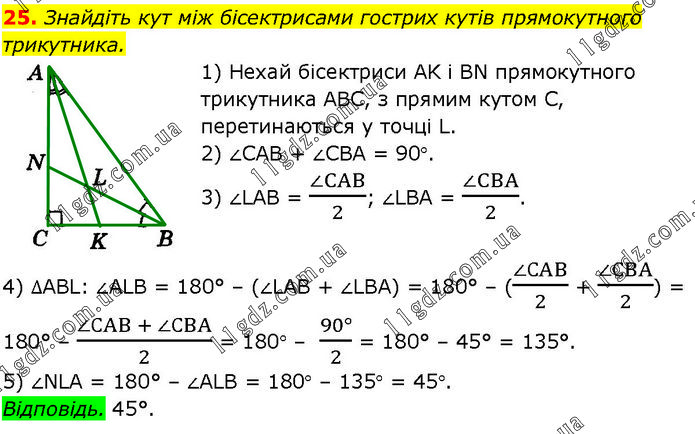 Знайдіть кут між бісектрисами гострих кутів прямокутного трикутника. 1) Нехай бісектриси AK і BN прямокутного трикутника ABC, з прямим кутом С, перетинаються у точці L. 2) ∠САВ + ∠СВА = 90°. 3) ∠LAB = (∠CAB)/2; ∠LBA = (∠CBA)/2. 4) ∆ABL: ∠ALB = 180° – (∠LAB + ∠LBA) = 180° – ((∠СAB)/2 + (∠СBA)/2) = 180° – (∠СAB + ∠СBA)/2 = 180° – (90°)/2 = 180° – 45° = 135°. 5) ∠NLA = 180° – ∠ALB = 180° – 135° = 45°. Відповідь. 45°.