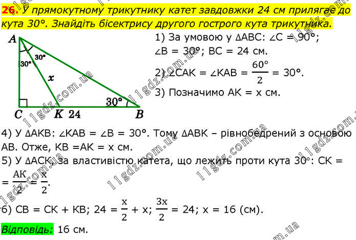 У прямокутному трикутнику катет завдовжки 24 см прилягає до кута 30°. Знайдіть бісектрису другого гострого кута трикутника. 1) За умовою у ∆ABC: ∠C = 90°; ∠B = 30°; BC = 24 см. 2) ∠CAK = ∠KAB = (60°)/2 = 30°. 3) Позначимо AK = х см. 4) У ∆AKB: ∠KAB = ∠B = 30°. Тому ∆ABK – рівнобедрений з основою AB. Отже, KB = AK = х см. 5) У ∆АСК, за властивістю катета, що лежить проти кута 30°: СК = АК/2 = х/2. 6) СВ = СК + КВ; 24 = х/2 + х; 3х/2 = 24; х = 16 (см). Відповідь: 16 см.